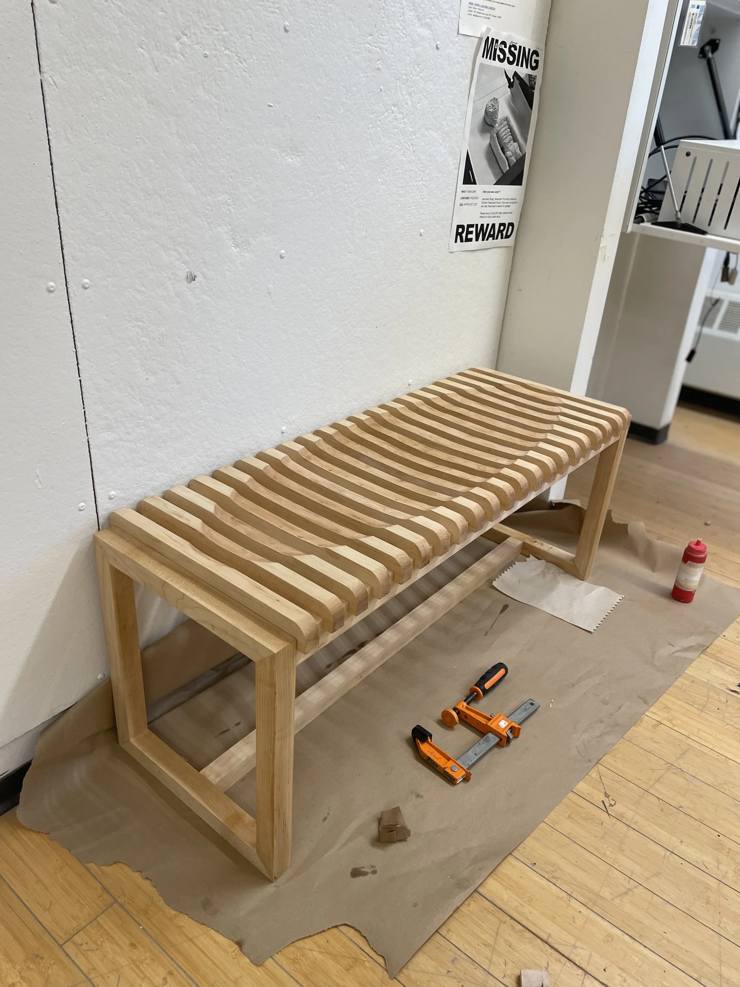 The Ellipses collection is a two-piece set featuring a bench and a storage cabinet. A single ellipsoidal motif anchors the design. In the cabinet, the elliptical form is immediately obvious, defining the overall structural shape. In contrast, the bench subtly incorporates the elliptical form by integrating the shape into the slatted wood. This interplay between the obvious and implied creates a cohesive, sculptural unity.